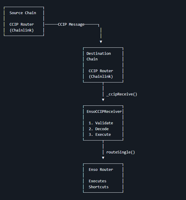 At the core of the integration sits the Enso CCIP Receiver, a destination-side smart contract that connects Enso’s execution engine directly with Chainlink CCIP, allowing cross-chain messages carrying ERC-20 tokens to trigger fully deterministic Enso Shortcuts workflows on arrival.