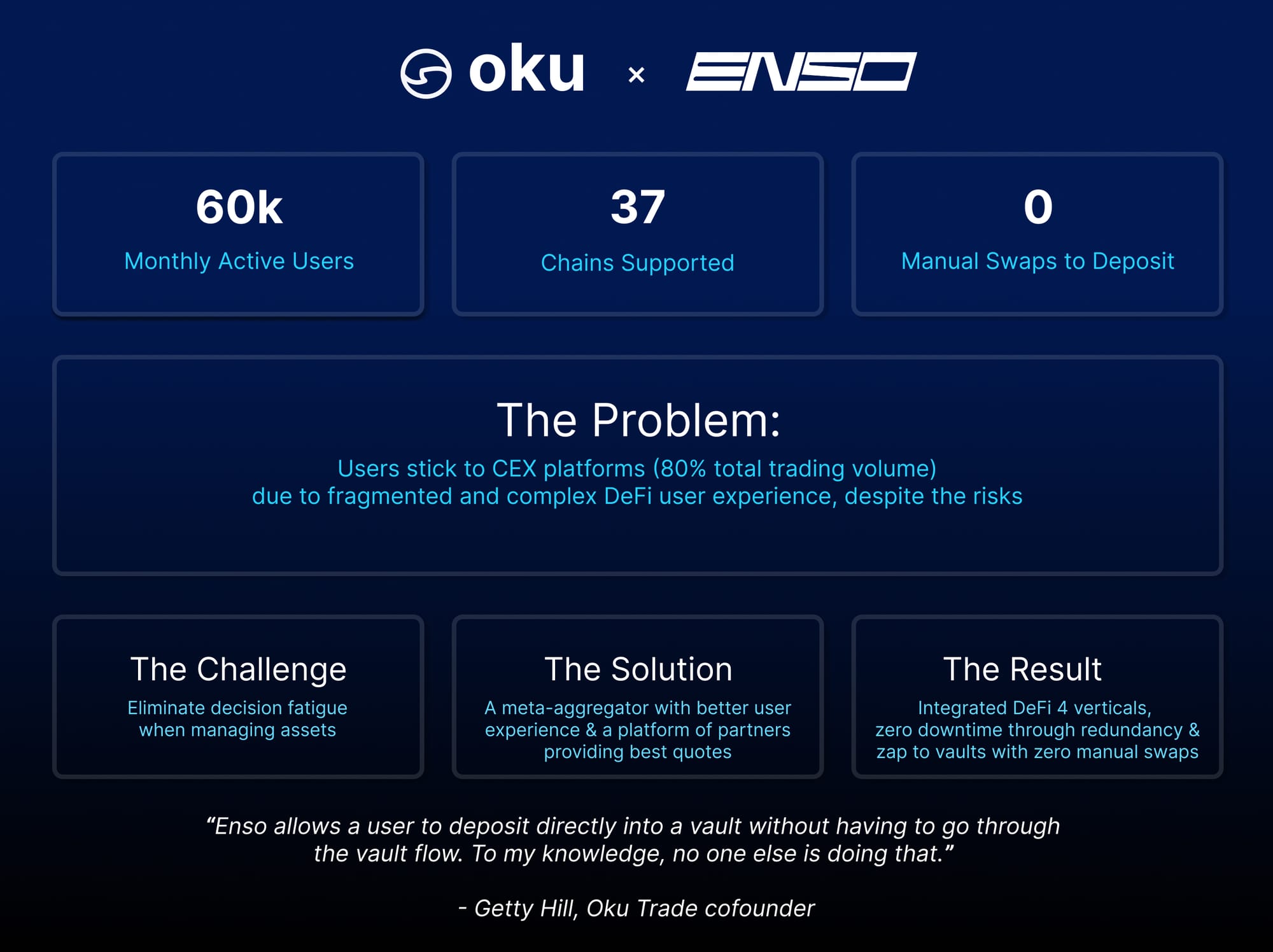 Within this ecosystem, Enso was integrated as a key swap router to enhance Oku's core goal of providing competitive quotes to end users. The decision was driven directly by performance and user feedback. As Trish Dougan, Head of Marketing at Oku, explains: