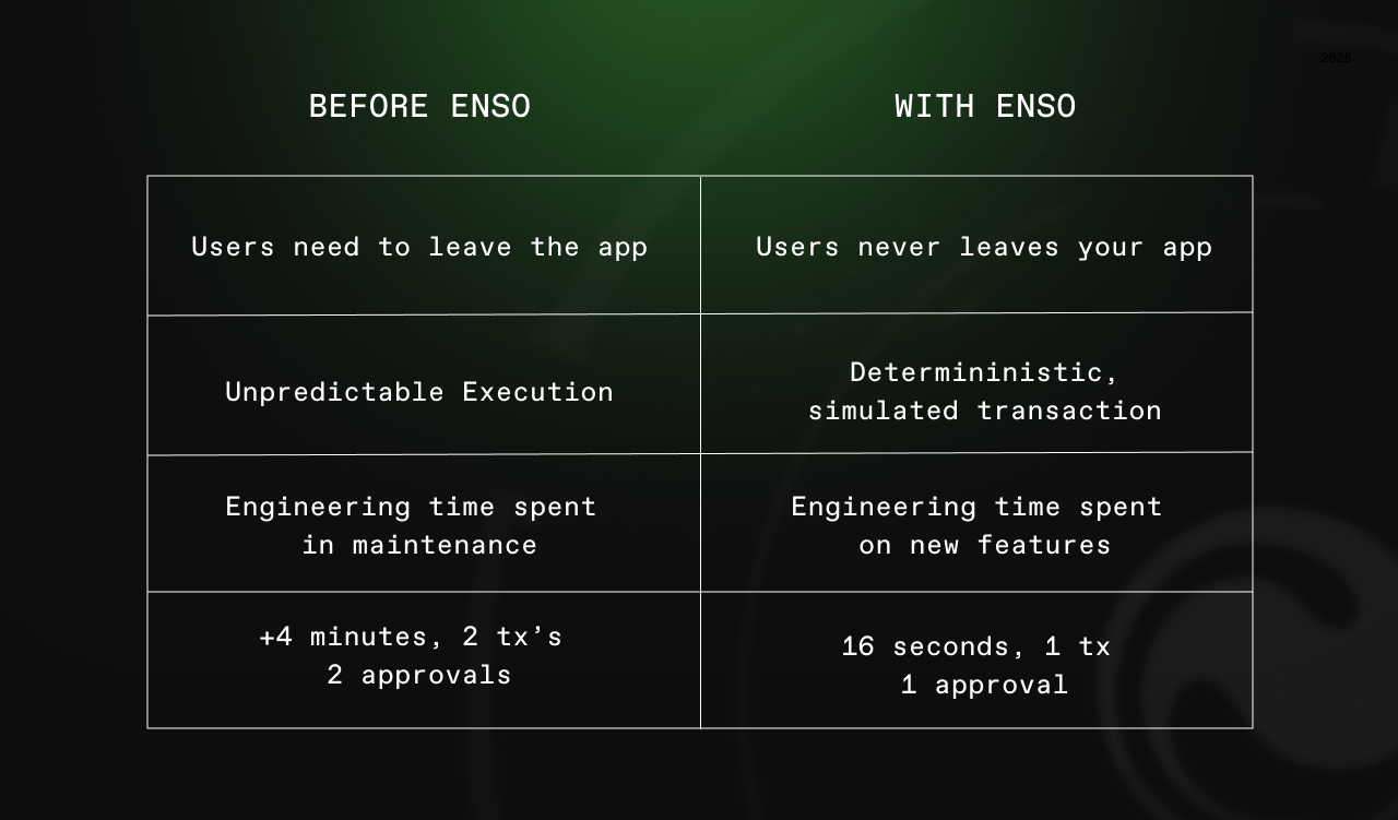 More importantly, Enso offered deterministic, simulation-backed execution across chains, a requirement for confidently onboarding and retaining large, cross-chain users.
