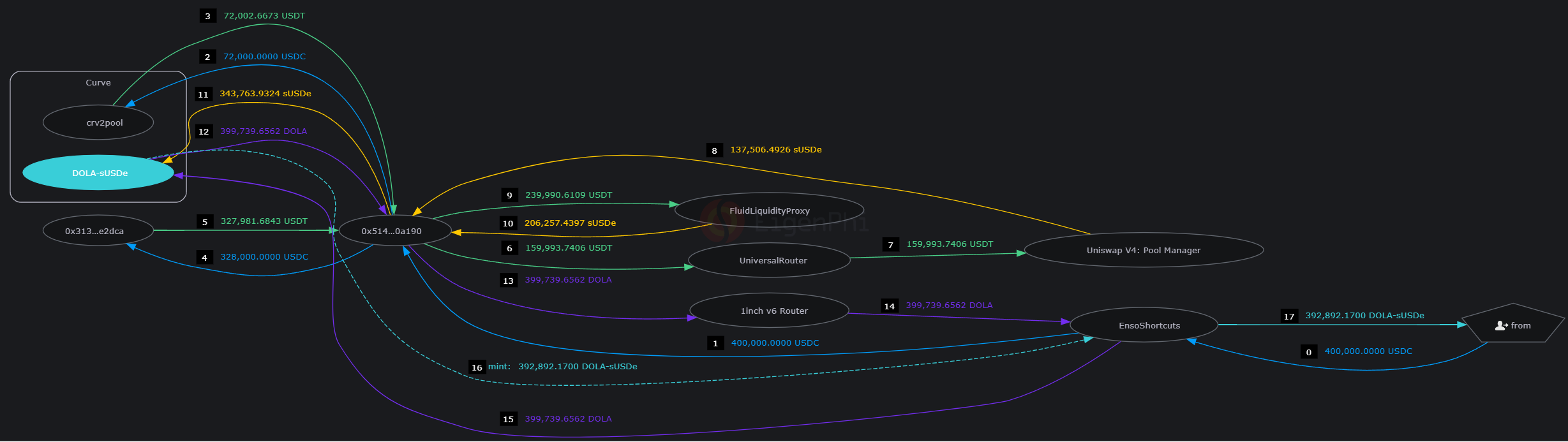 For example, getting sDOLA, Inverse's yield-bearing stablecoin is a two-step process, requiring a swap and a deposit: USDC → DOLA → sDOLA.