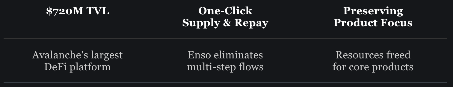 The decision to stay exclusively on Avalanche would have created UX and potential engagement issues: users would need to jump between several platforms, especially if they wanted to deposit to Benqi from other chains. The ingredient that enabled crosschain shortcuts to their users is Enso’s routing API.
