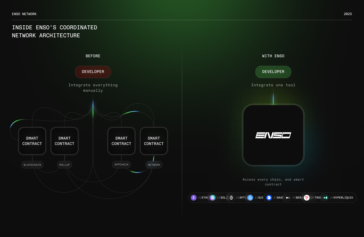 By abstracting actions into Shortcuts, Enso lets builders compose across every ecosystem from a single engine. Swap on one chain, deposit into a vault on another, bridge liquidity wherever it’s needed, all as if it were one environment.