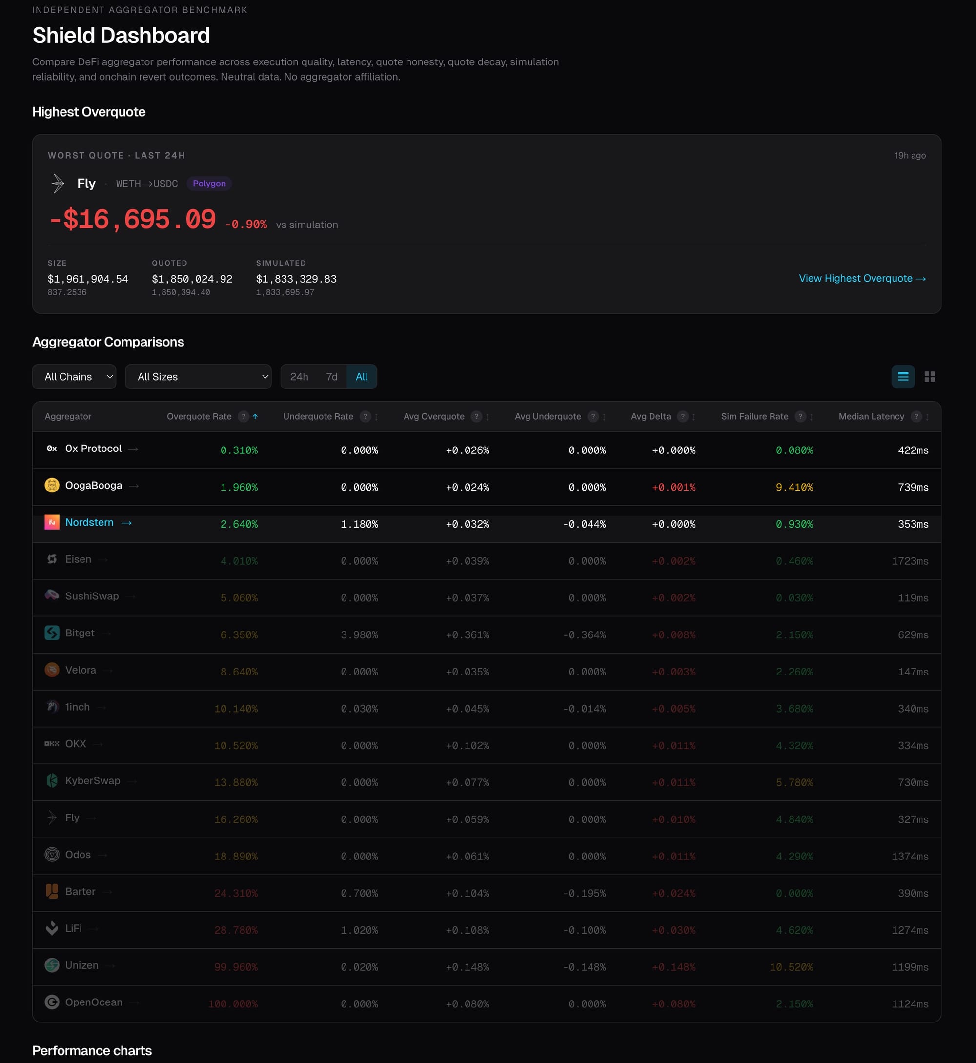 For each route, Shield requests quotes from every integrated aggregator in the same time window, simulates each one under shared constraints, and records the gap between stated quote and verified output.