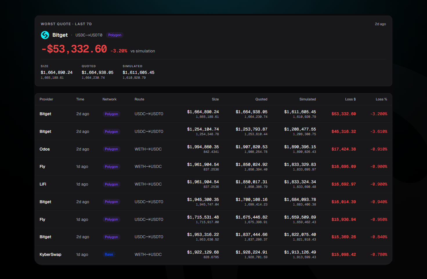 To put that into perspective, 3.2% is roughly what a user might expect to earn over an entire year supplying on Aave. In a single transaction, that yield can disappear purely due to quote inaccuracy.