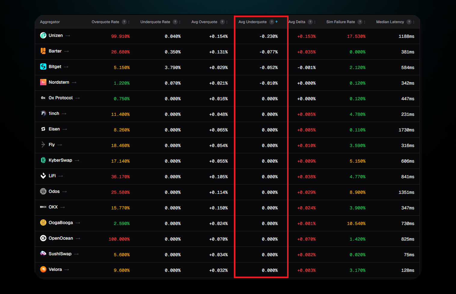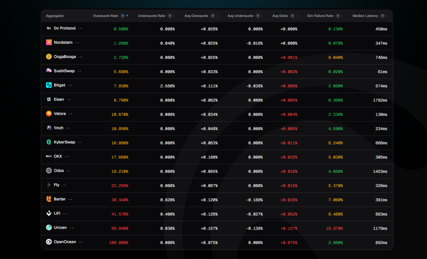 - Tier 1 (under 5%): 0x, OogaBooga, Nordstern, SushiSwap. These quotes are close to what the simulation confirms.