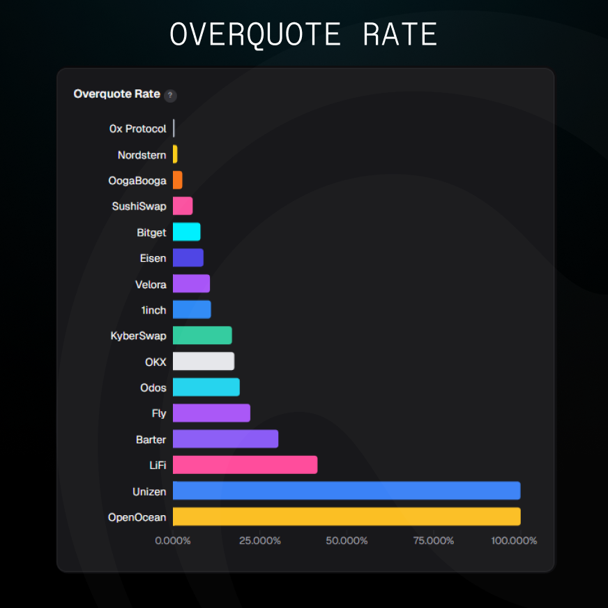 At one end: 0x Protocol at 0.25% overquote rate. At the other end, OpenOcean at 100%, every single quote it issues is inflated relative to what the simulation confirms.