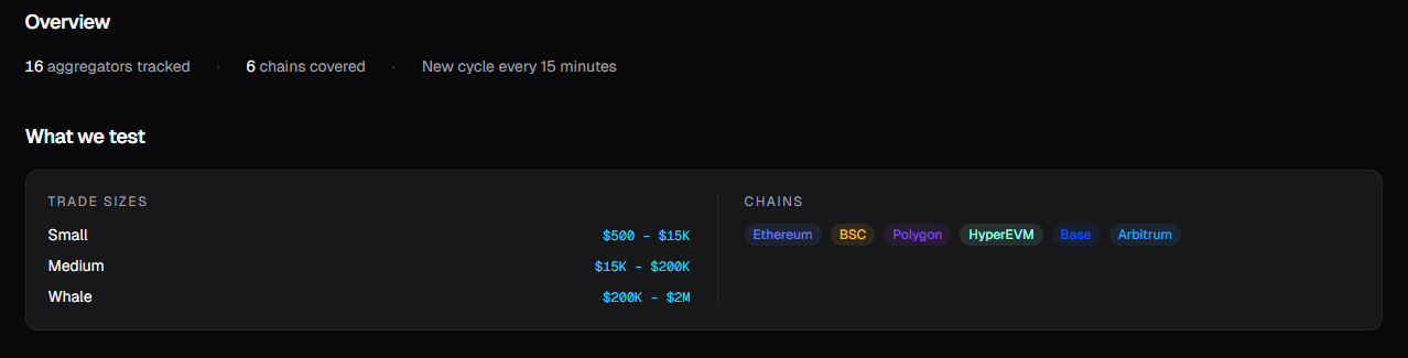 Filter to Small ($500–$15K), Medium ($15K–$200K), or Whale ($200K–$2M): the rankings stay the same. The same aggregators occupy the same positions across all size tiers. This behavior is structural, not situational.